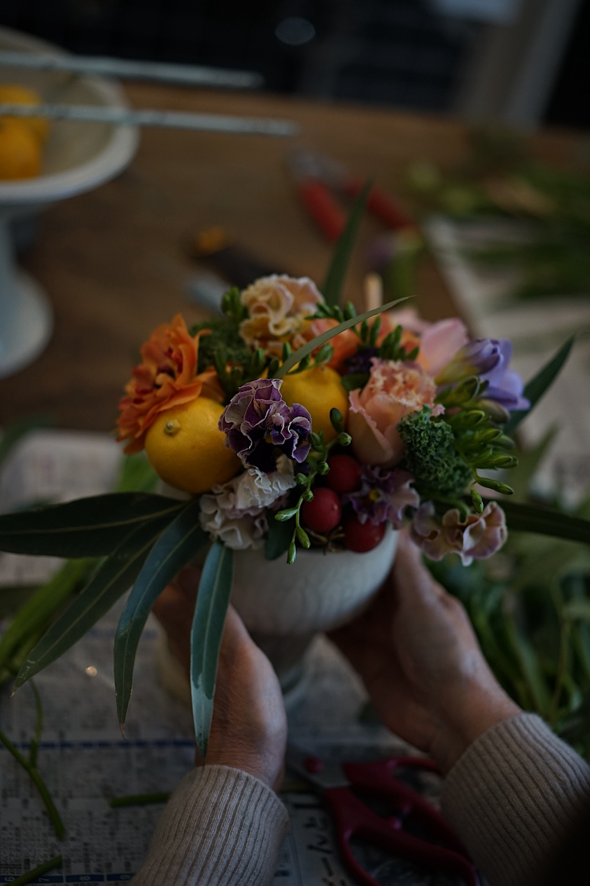 春のお花にお野菜や果物を合わせたアレンジメントを